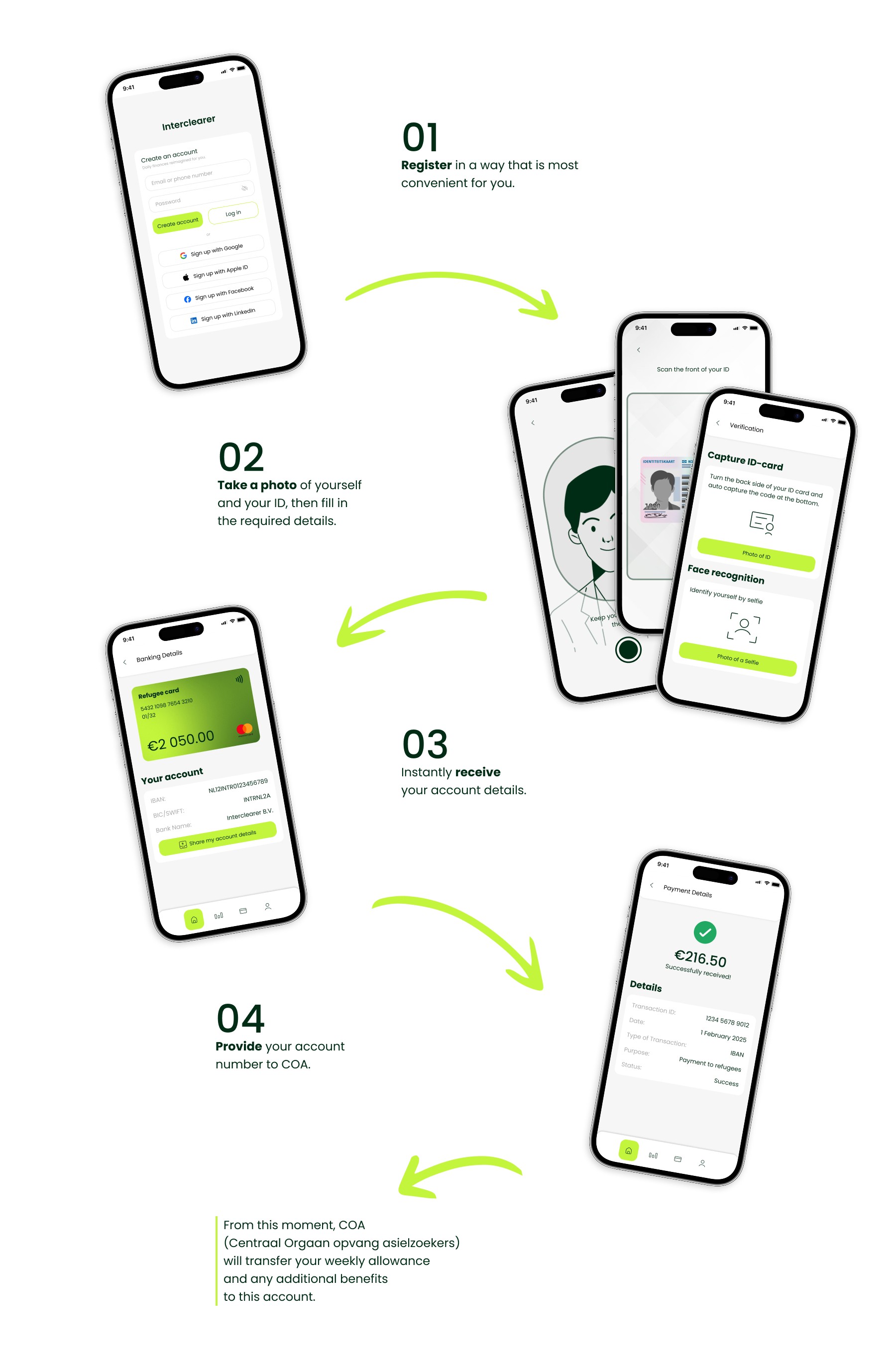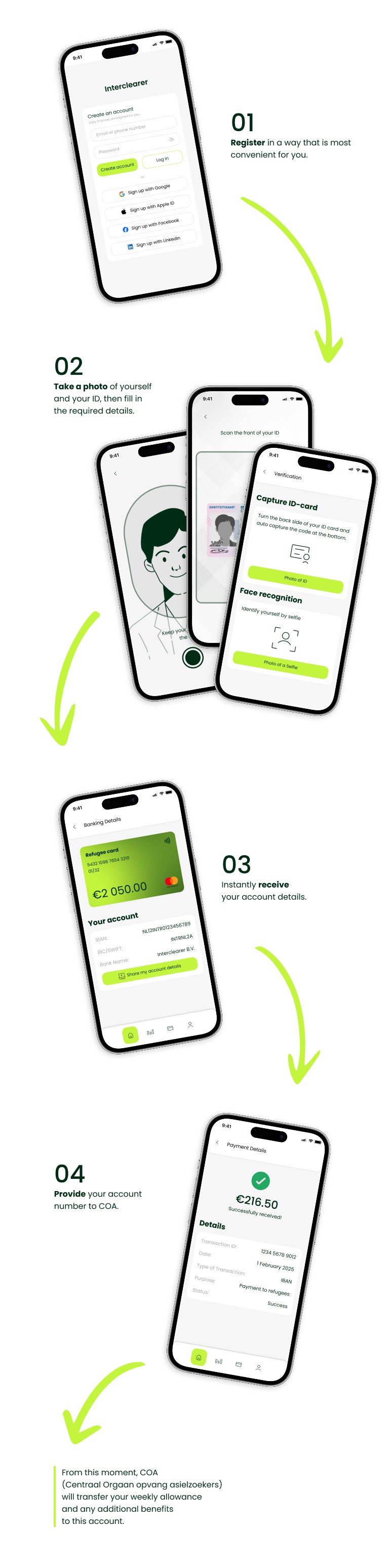 Traditional banks often have complex requirements for refugees. We simplify this by offering a quick online registration via Google, Apple, Facebook, or email. To comply with Dutch financial regulations, you only need to verify your identity using your refugee ID and a selfie—no residence permit or local credit history required.